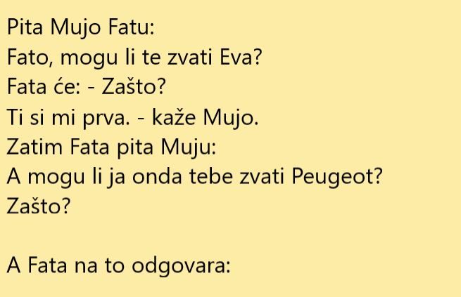 Danas prenosimo jednu priču koja se desila između Muje i Fate a riječ je o klasičnom podbadanju. Svakako to nije zdravo za brak, no Fata je iskoristila jedno zanimljivo poređenje i nađla je vezu između Muje i popularnog automobila Peugeot-a. Evo kako je to ispalo.