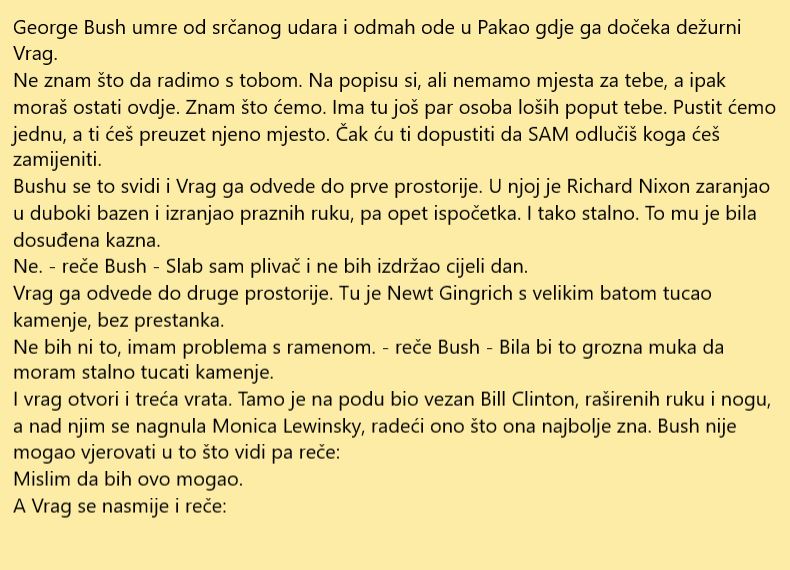 U ovoj priči imamo jednu zanimljivu anegdotu a na račun pozntog predsjednika USA George Bush-a. Radi se o tome da je došao u pakao i sad vrag ga sprovodi po paklu. Pročitajte i sami i nasmijte se od srca, a nakon toga ćemo malo više o samom mandatu George Bush-a kao predsjednika.