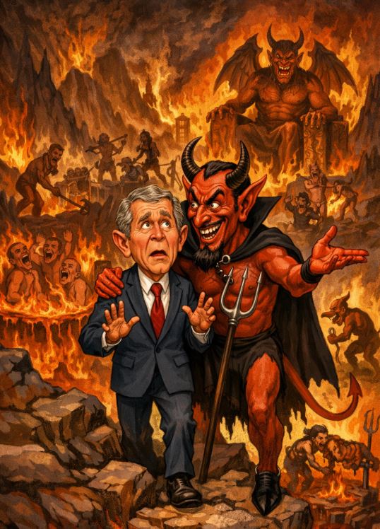 U ovoj priči imamo jednu zanimljivu anegdotu a na račun pozntog predsjednika USA George Bush-a. Radi se o tome da je došao u pakao i sad vrag ga sprovodi po paklu. Pročitajte i sami i nasmijte se od srca, a nakon toga ćemo malo više o samom mandatu George Bush-a kao predsjednika.