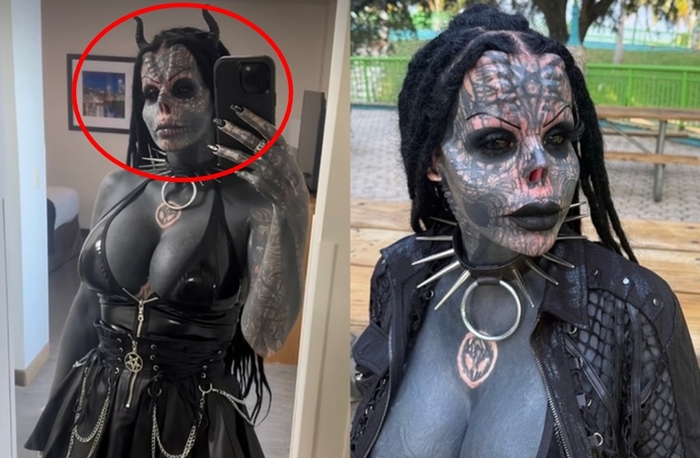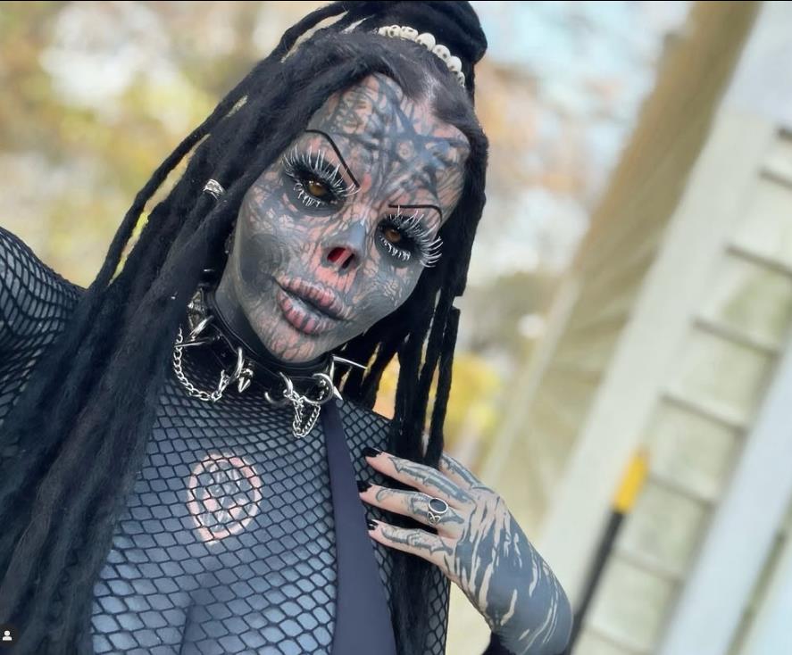 Njene fotografije “prije i poslije” na Instagramu prikazuju dramatičnu transformaciju: od žene s nježnim osmijehom do “kraljice tame” s crnim tetovažama koje pokrivaju lice, ugrađenim rogovima i tetoviranim očima. Ova transformacija uključuje i podjelu jezika, obojene i izbrušene zube te preoblikovane uši.