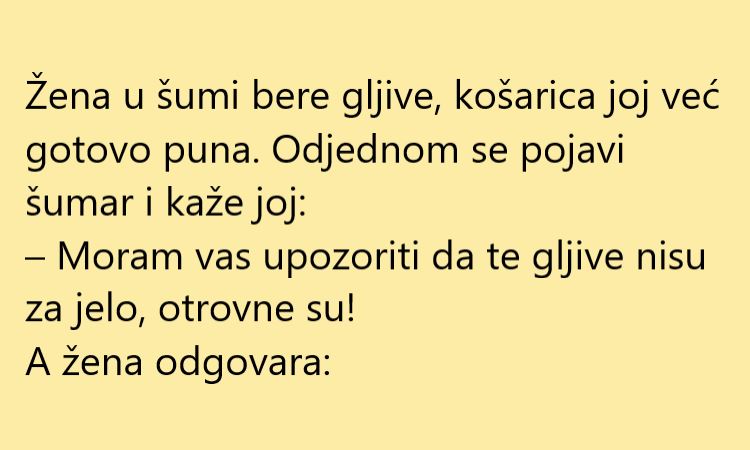 U današnjoj priči šumar je šetao u svom svakodnevnom obilasku kroz šumu, gdje je sreo jednu ženu koja bere gljive. Na njegovo zaprepaštenje, gljive koje je brala nisu bile za jesti već su bile otrovne. Ono što ga je još više zaprepastilo jeste njen odgovor na sve to.