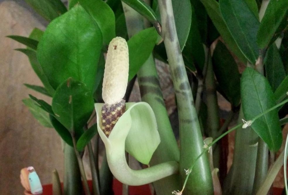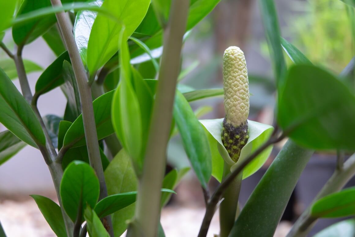 Iako rijetko cvjeta u kućnim uslovima, zamiokulkas može da razvije cvijet sličan onom kod kala – sitan, kremasto-bijeli klip okružen zelenkastim listom. Cvjetanje se obično događa kod starijih biljaka koje su dugo u stabilnim uslovima. Ipak, ljepota zamiokulkasa nije u njegovom cvijetu, već u njegovom prepoznatljivom, minimalističkom izgledu koji se uklapa u svaki prostor.