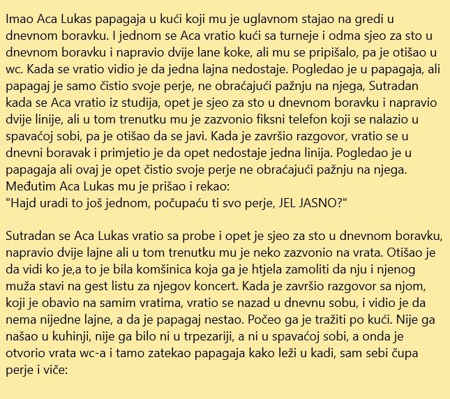 Aca Lukas je jedan od najpoznatijih i najpopularnijih pjevača u našem regionu. Proslavili su ga nebrojeni hitovi ali i njegov kontroverzni lifestyle. Publici širom Balkana je Aca poznat kao neko ko uživa u svim mogućim porocima a za određene poroke Aca lukas je postao jedna vrsta sinonima. Danas donosimo jednu anegdotu koju je Aca doživio sa svojim papagajom.