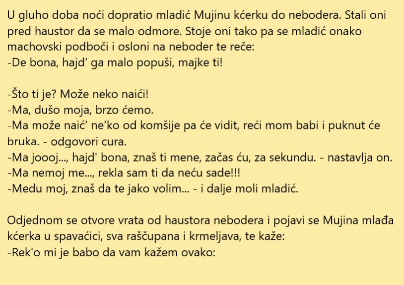 –Il mu ti pipu#i, il da mu ja popu#im il da mu mati popu#i kad se vrati iz noćne smjene ali nek skine konačno ruku s prokletog interfona.