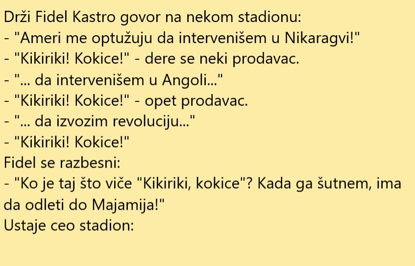 Fidel Castro je bio jedan od najpoznatijih lidera država ikada na svijetu. Ono što ga karakteriše jeste to što je vladao čak nekoliko decenija na Kubi. Bio je suveren vladar koji je održavao komunizam na Kubi. Imao je brojne neprijatelje a njegovi govori su postali planetarno popularni i gledani. Mnogi ga gledaju kao heroja, dok ga takođe mnogi i osporavaju i nimalo ne podržavaju. Danas donosimo jednu duhovitu priču koja se odigrala tokom jednog od njegovih govora.