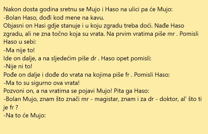 Evo jedna priča koja će vas od srca nasmijati. Nakon dosta vremena sreli su se Mujo i Haso. Muji je bilo drago što je sreo Hasu pa ga je pozvao kod sebe na kafu. Haso je prihvatio poziv vrlo rado. No kad je tražio vrata od Mujinog stana naišao je na čudan natpis.