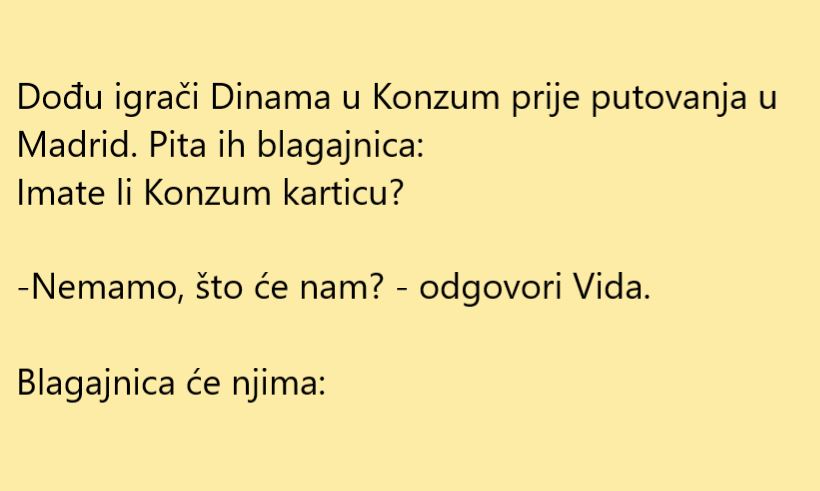 Igrači Dinama krenuli na putovanje u Madrid ali prije toga su krenuli u Konzum, poznati supermarket da kupe neke potrepštine. Domagoj Vida, kao tada najbolji igrač Dinama ušao je u konverzaciji sa kasirkom. Nije ni slutio šta će mu ona reći, prenosimo ovaj razgovor.