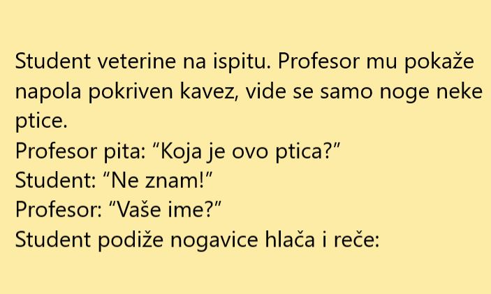 Za današnju priču prenosimo jedan dijalog sa ispita na veterinarskom fakultetu. Naime, profesor je pokušao da ispadne zanimljiv. Međutim studentu se to baš i nije svidjelo pa je odlučio na svoj način da izrazi neslaganje odnosno revolt.