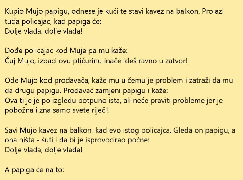 Papige su životinje koje su od početka svog postojanja fascinirale ljude. Najviše je fascinantna sposobnost govora, odnosno tačnije sposobnost imitiranja zvukova iz njene okoline. U ovoj priči imamo Muju koji je kupio papigu koja priča ali je pravila problem zbog stvari koje je pričala.
