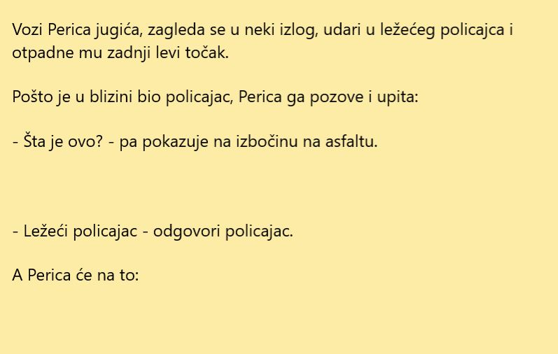 Rijetko ko voli ležeće policajce. Zapravo rijetko ko voli policajce. Ali teško ćete naći nekoga ko ne zna šta je ležeći policajac. Tako imamo u ovoj priči Pericu koji je brzo naletio na ležećeg policajca ali niej znao šta se desilo. Priča vodi u jednom duhovitom smjeru. Za kraj ćemo ispričati malo više zanimljivosti o ležećim policajcima.