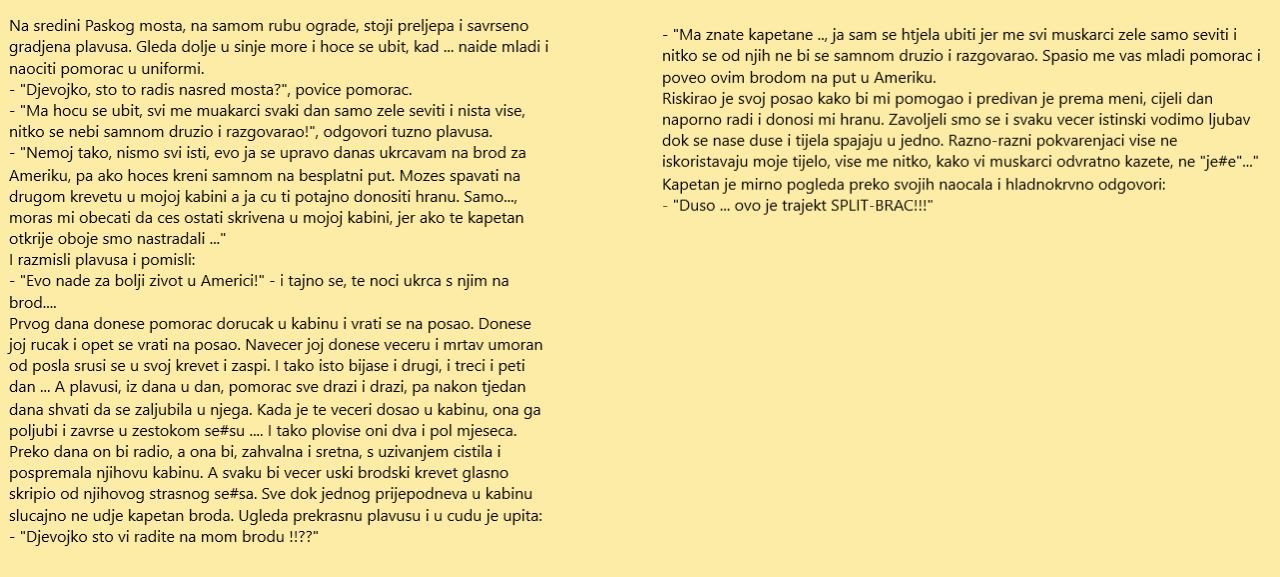 Jedna jako zanimljiva priča o dosjetljivom moreplovcu koji je iskoristio naivnost jedne žene. Naime, znamo svi da bi muškarci svašta uradili za malo akcije. No, ipak ovako domišljati su rijetko koji. Pročitajte priču i sve će vam biti jasno. Nakon priče slijedi malo zanimljivosti koje će vas sigurno oduševiti.