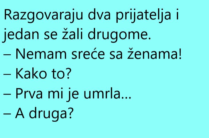 Jedan čovjek nije imao sreće sa ženama. U jednoj prilici, jadao se svom prijatelju te je spomenuo da mu je prva žena preminula. No kad ga je prijatelj pitao za drugu ženu, on je dao odgovor koji ga šokira i nasmijava do suza. Nastavak priče slijedi.