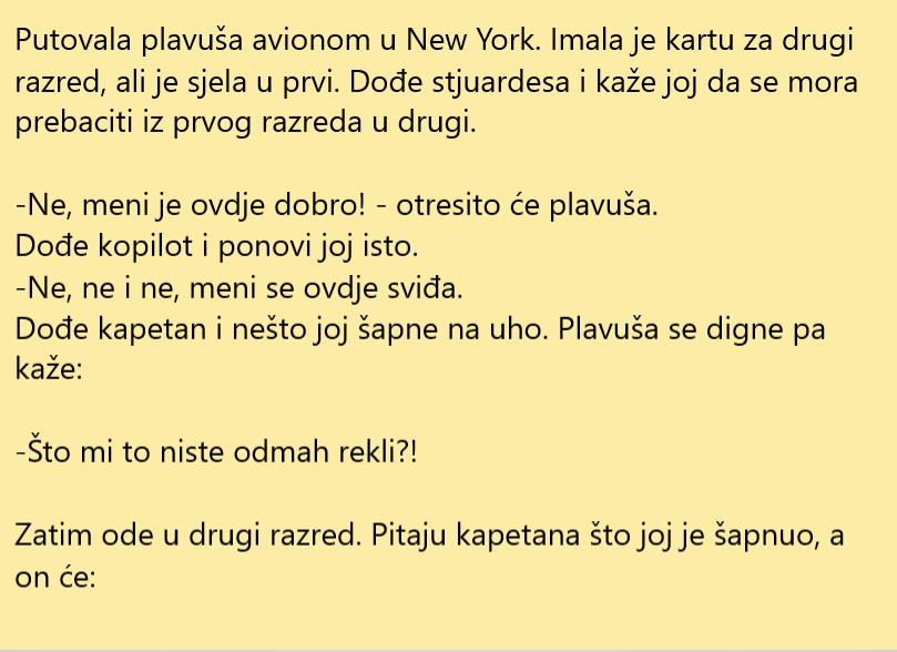 U današnjoj priči imamo plavušu koja putuje prekookeanskim letom za New York. Plavuše su oduvijek bile predmet dobrih šala, pa tako i u ovoj priči malo ćemo se našaliti na račun ove plavuše. Naime, ona je greškom sjela u prvi razred u avionu a imala je kartu za drugi. Nakon nekoliko upozorenja, odbijala je da sjedne u drugi razred. No pilot je imao odličnu strategiju kako da je ubijedi.