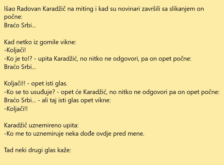 Radovan Karadžić je svima poznat sa ovih prostora. Svi znaju to ime. Jedna manjina gleda na njega kao heroja dok većina ljudi nema lijepo mišljenje o njemu. Presuđeni Haški osuđenih zbog zločina koje je počinio dok je obnašao funkciju predsjednika entiteta RS. No danas ćemo se malo našalit na njegov račun. Evo jedna jako zanimljiva priča.