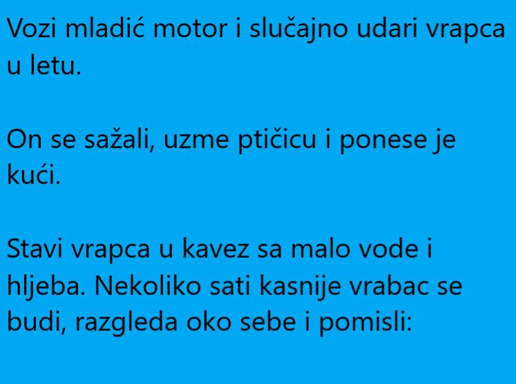 Ova priča desila se tokom svakodnevne vožnje. Jedan mladić vozio je svoj motocikl i desilo mu se da je udario vrapca u letu. Bilo mu je žao vrapca pa je odlučio da mu pomogne. Ono što je vrapcu prolazilo kroz glavu nasmijalo je sve čitaoce. Trebamo naglasiti da su ove situacije jako opasne po motocikliste i stoga apelujemo da ukoliko vozite motor prilagodite brzinu uslovima na putu i budete oprezni.