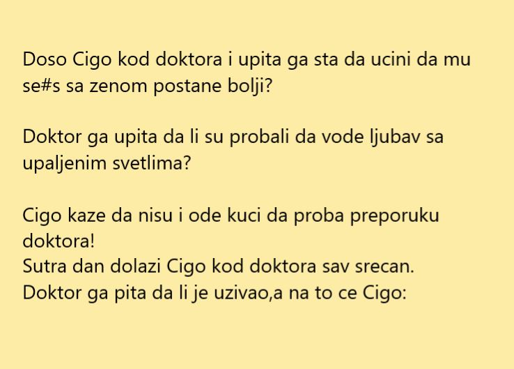 Jedan Ciga je zapao u ljubavne probleme sa svojom suprugom Šta da radi, sjetio se da ode kod doktora i da se požali. Doktor mu je dao neko rješenje, ni sam nije vjerovao ali je odlučio da proba. No, tek tada su nastali problemi a da nije bio ni svjestan.