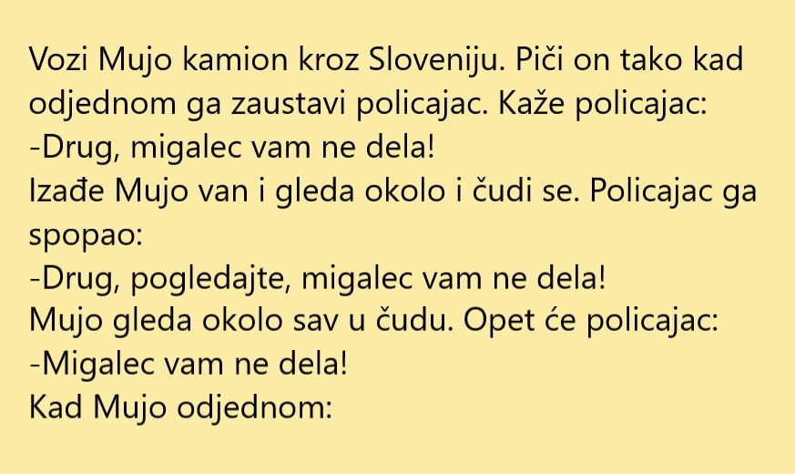 U ovoj priči imamo jednog bosanca, Muju koji je krenuo trbuhom za kruhom u bijeli svijet da vozi kamion. To nije nimalo lagan posao a dosta ljudi se odluči voziti kamion jer je dobro plaćen posao. U priči se prenosi jedna zanimljiva situacija gdje je Muju zaustavila policija te je nastala jedna humoristična scena.