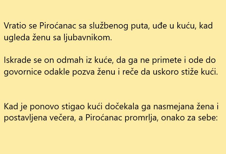 Šale o Piroćancima su poznate širom balkana. Uglavnom se Piroćanci spominju kao škrti ljudi koji su teški na davanju novca. Šta vi mislite? Ako ima među vama Piroćanaca molimo da se javite i demantujete ili potvrdite ovu teoriju. A sada slijedi jedna jako zanimljiva i duhovita priča.