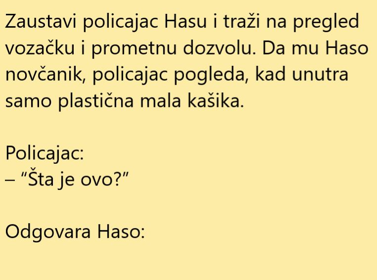 Policija u Bosni i Hercegovini je svojevremeno važila za jako korumpiranu. Popularno je bilo da im se pokloni 10 ili 20 KM u zamjenu za oprošten saobraćajni prekršaj. Hasu je tako zaustavila policija a on nije imao novca kod sebe. No, dosjetio se jedne stvari a evo kako je to bilo.