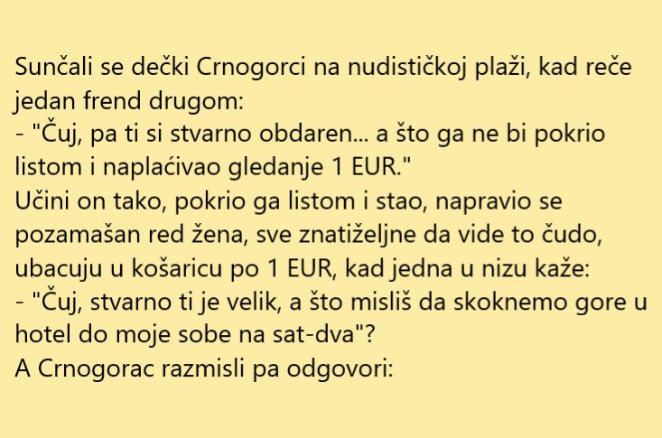 Crnogorci su jedna posebna nacija koja ima malu ali prelijepu državu koju ispunjavaju velike planine a odmah iza planina prelijepo Jadransko more. Ono što je karakteristično za crnogorce jeste poznata legenda koja se vezuje za njih a to je da su lijeni. No, zašto je to tako, teško da danas iko ima odgovor na to pitanja. No svakako da se možemo našaliti na taj račun pa u korist tome evo jedna duhovita priča.